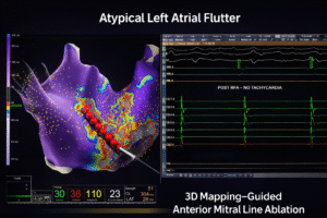 Atrial arrhythmias in patients with prior coronary artery bypass grafting (CABG) can be complex, challenging, and often recurrent. Scar-related circuits, atrial remodeling, and structural heart disease make diagnosis and management significantly more demanding. This case highlights an atypical left atrial (LA) flutter successfully diagnosed and treated using advanced electrophysiological study (EPS), high-density (HD) mapping, and […]