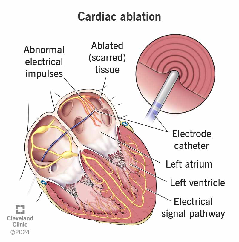 Catheter ablation is a procedure performed by electrophysiologists (heart rhythm specialists) to treat irregular heartbeats, particularly atrial fibrillation. It involves guiding thin, flexible tubes (catheters) into the heart through blood vessels, most commonly via the groin. Once inside, the doctor delivers targeted energy—either radiofrequency (heat) or cryotherapy (cold)—to destroy small areas of heart tissue that are triggering abnormal electrical signals.